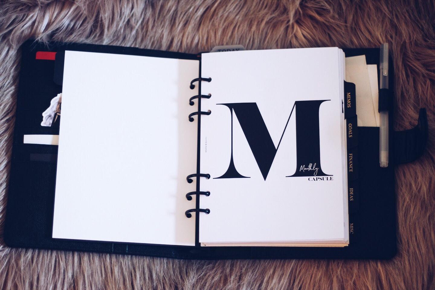 To set up my planner, I ordered Cloth & Paper’s A5 6 ring agenda in black, 2018 monthly capsule planner inserts, 2018 dated daily capsule inserts, gold foiled ceo dividers, black paper inserts, and matte black tape. I also ordered stickers from etsy (favorite shops here, here, and here) and accessories like page markers, white and black pens, and black sticky notes from Amazon and Muji.